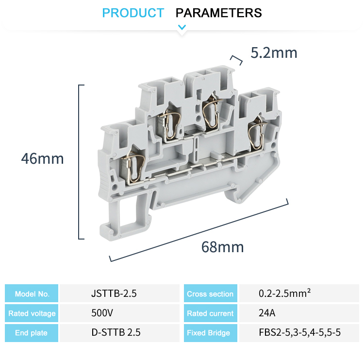 マルチレベルのターミナルブロックは、コンパクトスペースでの高密度配線用のスプリングロードされた3層PA66/ニッケルメッキのブラスデザインを備えています。炎のリターン剤の耐久性、腐食防止接点、ガスタイト接続、およびDINレールNS35互換性を提供すると、レベル固有の関数シャフトと統合ラベルを介して潜在的な分布を簡素化します。モジュラーアクセサリ(エンドキャップ、ブリッジ)とユニバーサルマウントは、電気システムを要求するための信頼できるスペース節約性能を確保します。