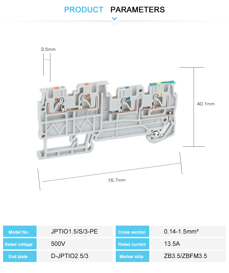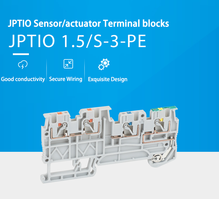 JPTIO1.5/S/3-PE 端子台 端子台は、難燃性ナイロン PA66、真鍮導体、ステンレス鋼圧縮バネを採用しており、過酷な使用条件下でも電気的安全性と機械的強度を確保しています。