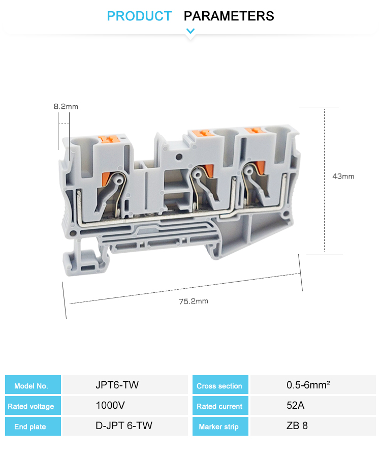コンパクトな構造とプラグアンドプレイの利点を備えたJPT16TW端子ブロックは、機器のデバッグと回路の変更のコアコンポーネントになりました。 JPT16TWターミナルブロックは、電気機器と回路基板の多様なシナリオに適応でき、その単純な操作と強力な接続性は、頻繁なラインの変化を伴うプロジェクトの効率を大幅に改善します。