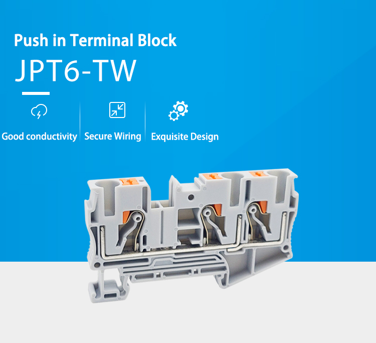 JPT16TW端子ブロック(プッシュイン)ツールフリー回路コネクタとして、ユーザーはケーブルを押すことで安定した電気接続を完了できます。 jpt16tw端子ブロック製品は、複数の環境で耐久性と信頼性の高い動作を確保するために、高温抵抗と耐食性を備えたエンジニアリングプラスチックまたは金属で作られています。