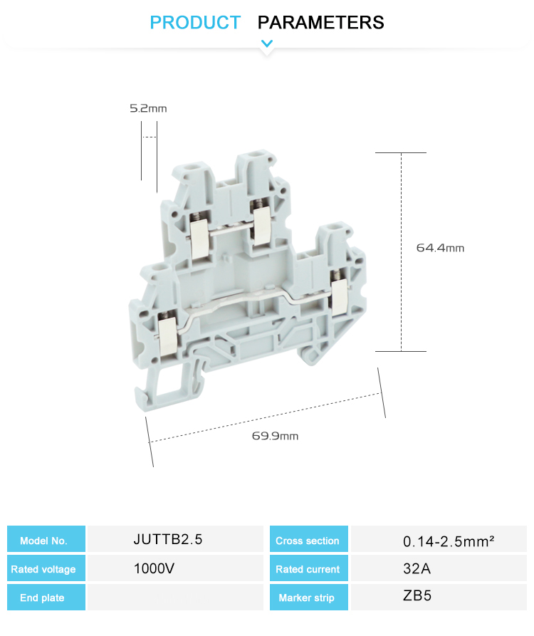 UTTB2.5デュアルステージスクリュー端子ブロックは、産業および商業用の設定で効率的で安全な電気接続のために特別に設計されています。 2.5mm²の容量で、電流が中程度と中程度のシナリオに適しています。 DINレールは簡単に取り付けられ、2段階の構造がスペースを節約します。ネジ接続は、防止防止と気密であり、固定/ねじれた銅線と互換性があります。高品質の難燃性材料は、耐熱性があり、耐衝撃性のある業界基準を満たしています。制御キャビネット、配電システムなどに適しており、信頼できる接続ソリューションを提供します。